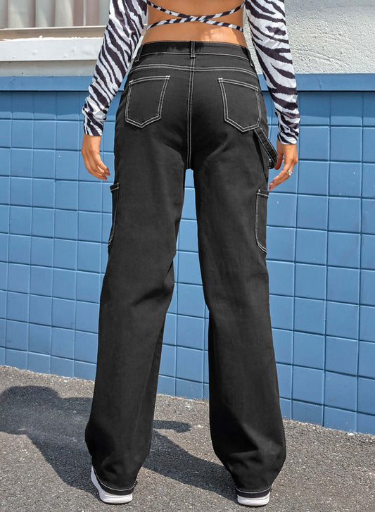 Black High Waist Straight Leg Cargo Pants with Pockets