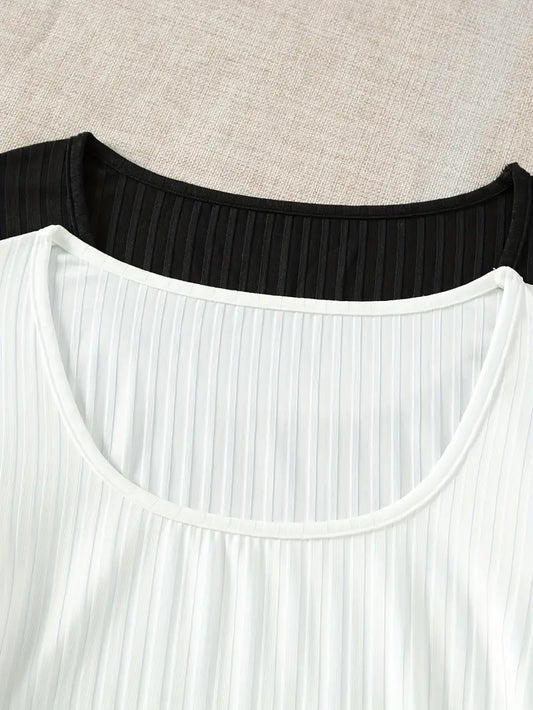 Solid Rib Knit Bodysuit, Casual Scoop Neck Long Sleeve Bodysuit